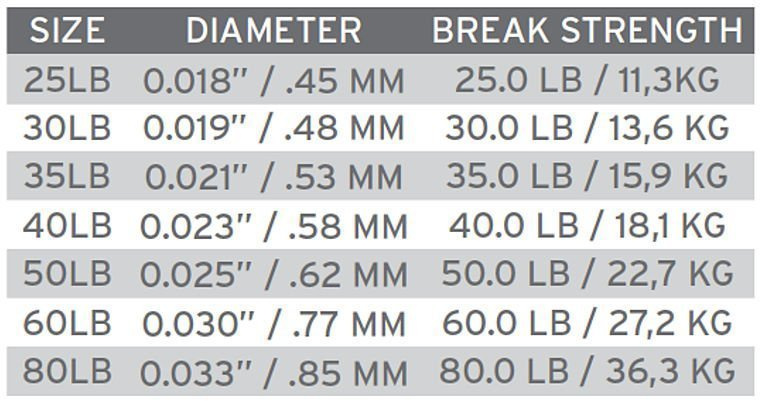 • Length: 30m spools in all sizes - Sizes: 25lb – 80lb.