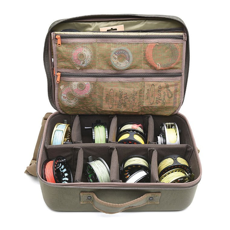 This bag is a real multi-purpose bag for the enthusiastic fly fisherman. It can be used as a spacious reel bag, accommodating a big bunch of differently sized fly reels but thanks to its genius inner wall system you can modify it as you like, according to your needs. In addition to reels you can make a supportive space for your digital SLR or video camera. Or you can use it as a big fly tying bag when travelling. The soft divider gives extra protection when the bag is closed and its numerous zipper pockets keep your small accessories in order and easily accessible. The moulded bottom part is waterproof up to the rivets and stiches, so it can easily be left on the bottom of your boat. Military green colour scheme.
