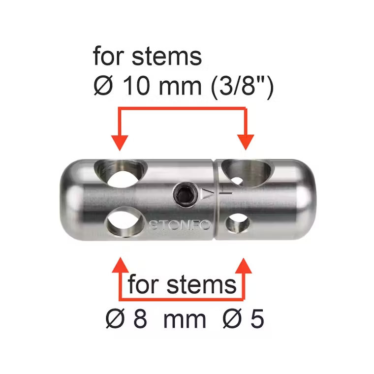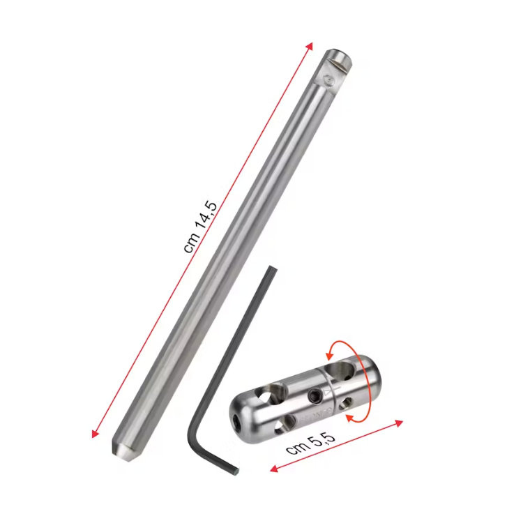 Stainless steel joint with angular adjustment. The packaging includes 1 joint, 1 extension stem 145 mm long and 1 allen key.