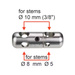 Suitable for every vise with base or table clamp equipped with stem from 8 to 10 mm (3/8”) and for attachment stems from 3 to 5 mm.