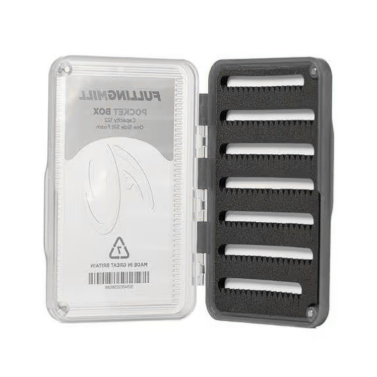 The Pocket Box is the smallest of the range. This lightweight box features a sleek, frosted lid so you can see your flies. Inside is a one sided high density, 4mm slit foam with capacity for up to 122 flies. As the name suggests, this box will fit snugly into the average shirt or trouser pocket, making it the ideal day box.