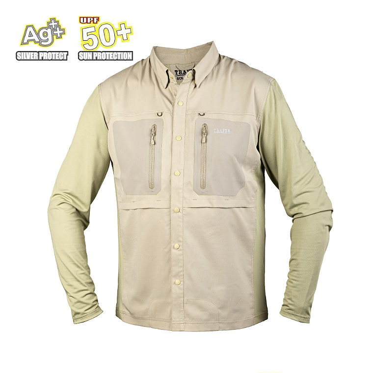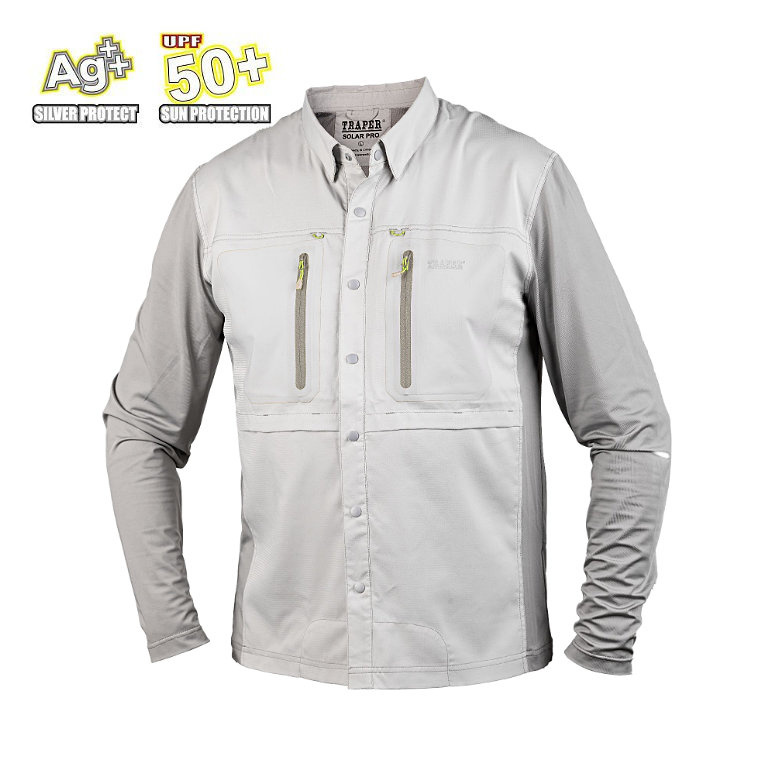 The Solar Pro shirts are made perfectly of the highest quality fabrics. There were used two various fabrics. The arms and sides are constructed in extremely soft and stretchy polyester with spandex. It distributes moisture out adhering the body. The rest is made of UPF 50 polyester. It works as a superb sun ray barrier. The collar is can be picked up when the sun is brightly shining. There are two chest seamless and zippered pockets. We can store there fly boxes. There are two loops for mounting accessories nearby the pockets.