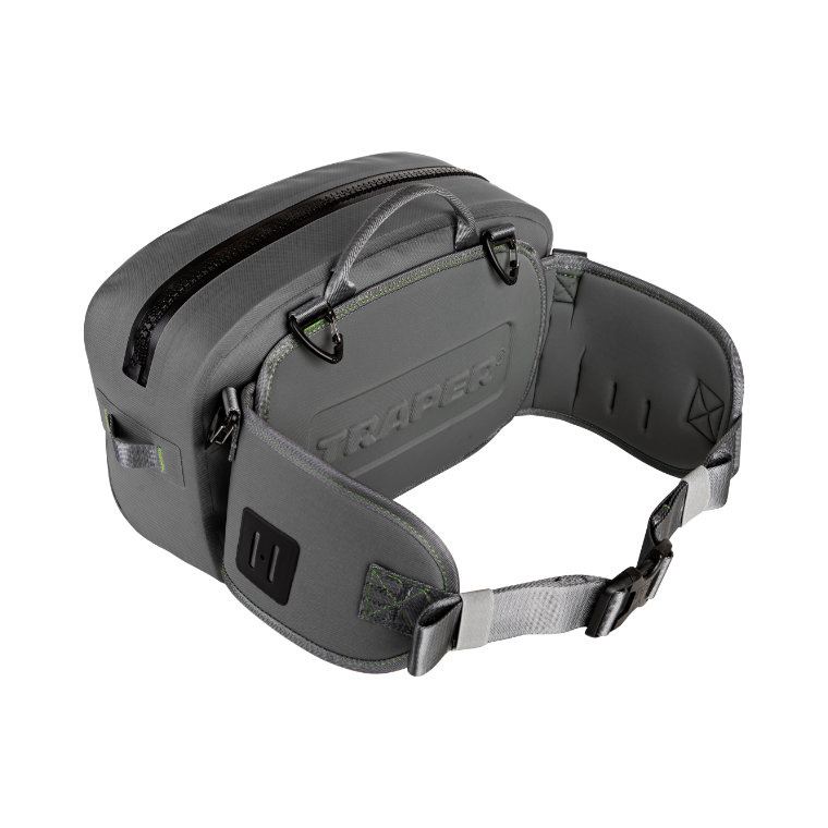 The Hippack is manufactured of the totally waterproof 840D fabric, double side laminated with the TPU technology. The waterproof YKK zipper is used for closing the main chamber. There is a two chamber zippered pocket inside. There is an external pocket with splashproof YKK zipper. The comfortable arm belt and hip belt are used for carrying. The landing net snap, loops, sliding mount for pliers, rubbers and Velcro for patch. The back of the bag is stiffened with the pressed soft panel. There is carrying handle over it. There are two snaps on the top back of the Hippack, for mounting it to one of our Extreme backpacks. We can use it after detaching the Velcro mounted hip belt.