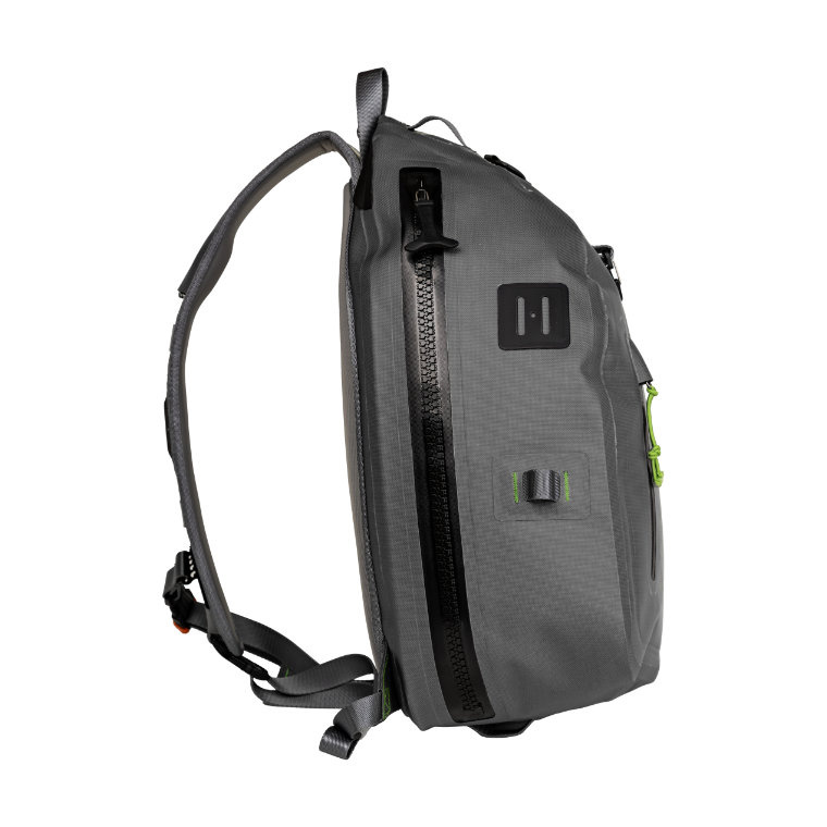 The Slingpack is manufactured of the totally waterproof 840D fabric, double side laminated with the TPU technology. The possibility of pumping the backpack after the tight closing is an innovative feature. The chamber is 100% tight, thanks to the use of the Japanese, extremely precise YKK zipper and the valve. The Slingpack is totally floating even if fully packed. There is a two zippered compartments pocket inside the chamber. The external documents pocket is zippered with the splashproof YKK zipper. There is a carrying handle and the landing net mount on the top of the bag. The side flexible clamps can be used for carrying the spare rod or the wading stick. The Slingpack's arm belt is blocked with the flexibly adjustable side belt. After detaching the side belt one can easily change the position of the bag from back to front and have the easy access to the interior. There is a sliding mount with snap, rubber for pliers and the Velcro for fly patch.