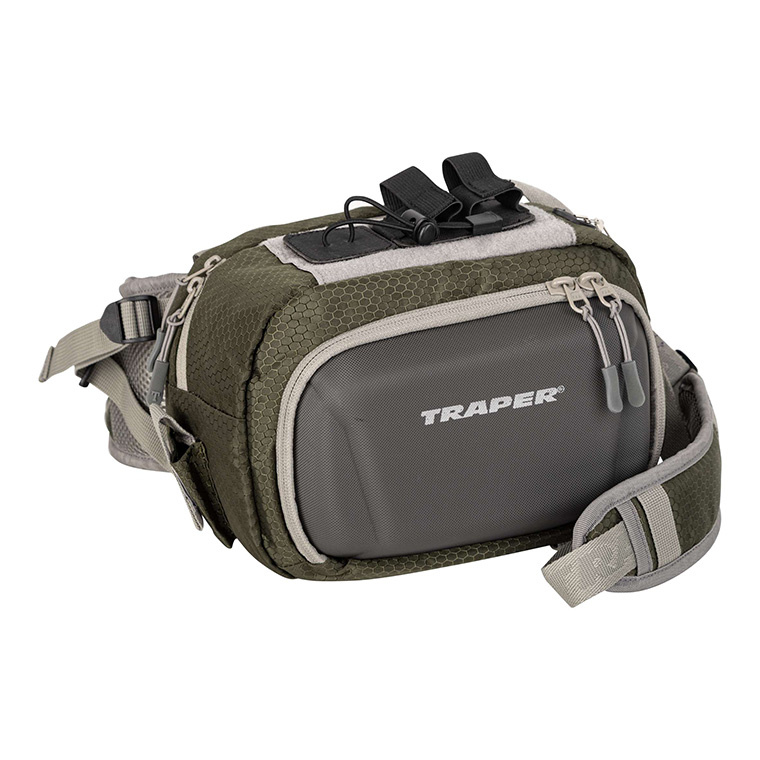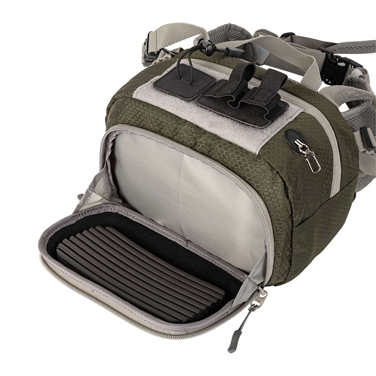 There are two net pockets in the main chamber. The front, stiffened pocket consists large fly patch. There is a zinger on the side and the pliers' pouch on the opposite side. There is a Velcro with the detachable liquid mount and the second with the transportation rubber rope. There are carrying belts on the bottom for mounting clothes (such as rainproof jacket). The waist belt and the back are soft, circulation net padded.