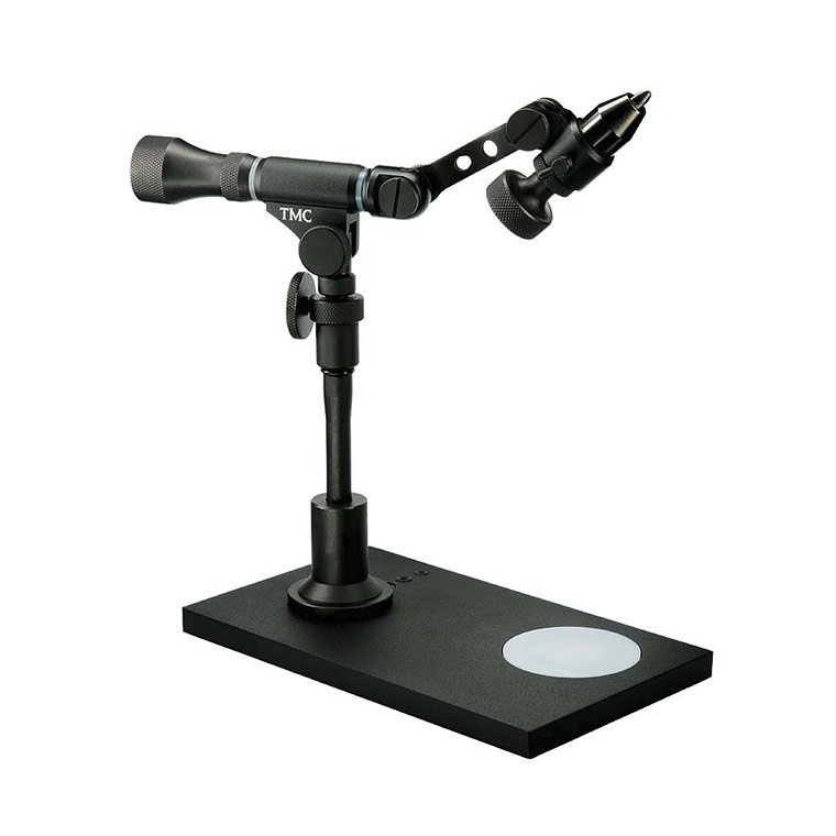 This is the most advanced true rotary vise. This vise will give you the feeling that the jaw alone is floating in the air by itself. The U-shaped offset arm , which supports the jaw at the other side from the tyer, allows maximum clearance behind and around the hook. The TMC Vise comes with the standard jaw, which will handle hooks from 32 to 1/0.Enclosed the large jaw will handle hooks from 4 to 8/0 hooks.